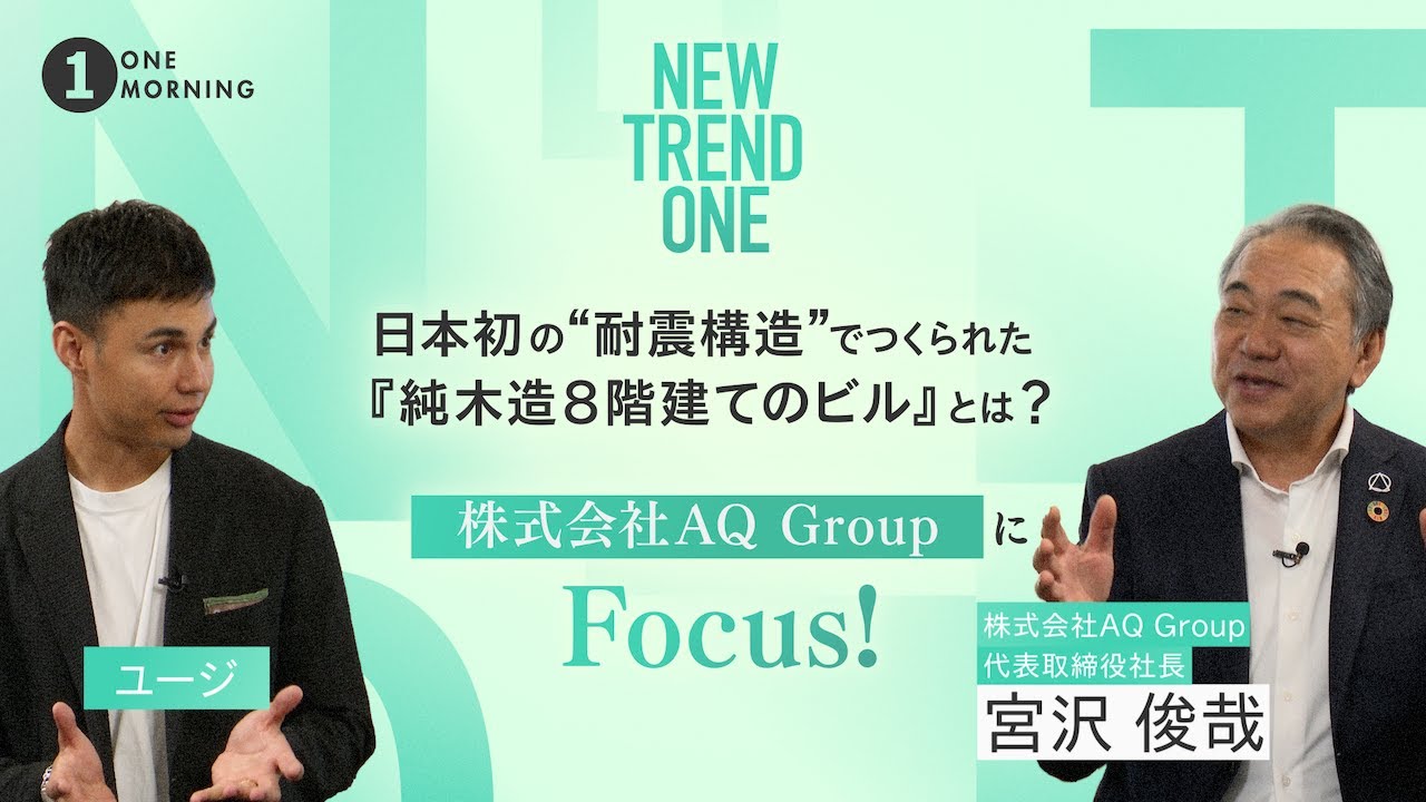 「ONE MORNING『NEW TREND ONE』日本初!“免震装置”に頼らない“耐震構造”で作られた 純木造8階建て「AQ Group」の本社ビルにFocus!」という「AQ Group」の本社ビルなどの取り組みについて取り上げている動画ニュースが、youtube(TOKYO FM – official)にて公開されています。