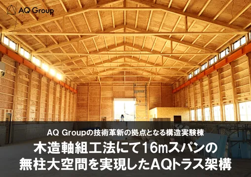 AQ Group全社の研究を集約する場所として木造建築技術研究所を建設中。1棟目の構造実験棟は木造軸組工法平屋建て512㎡、天井高はトラス下約7.0m・最高9.6mで4月に竣工。構造材は全て住宅用流通材を使用し意匠権出願中のAQトラスにて1...