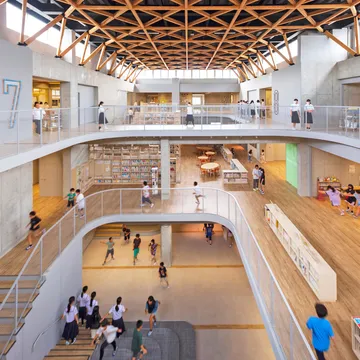 「まちづくりは、ひとづくり」という、市の地域活性化への想いを込めた施設一体型の義務教育学校。子どもはもとより、大人も共に学べる地域のひとづくりの拠点となる「これからの学校」の在り方を示した。学校の中心に計画した「メディアコモンズ」では多様な...