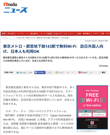 →『東京メトロ・都営地下鉄143駅で無料Wi-Fi 訪日外国人向け、日本人も利用OK – ITmedia ニュース』