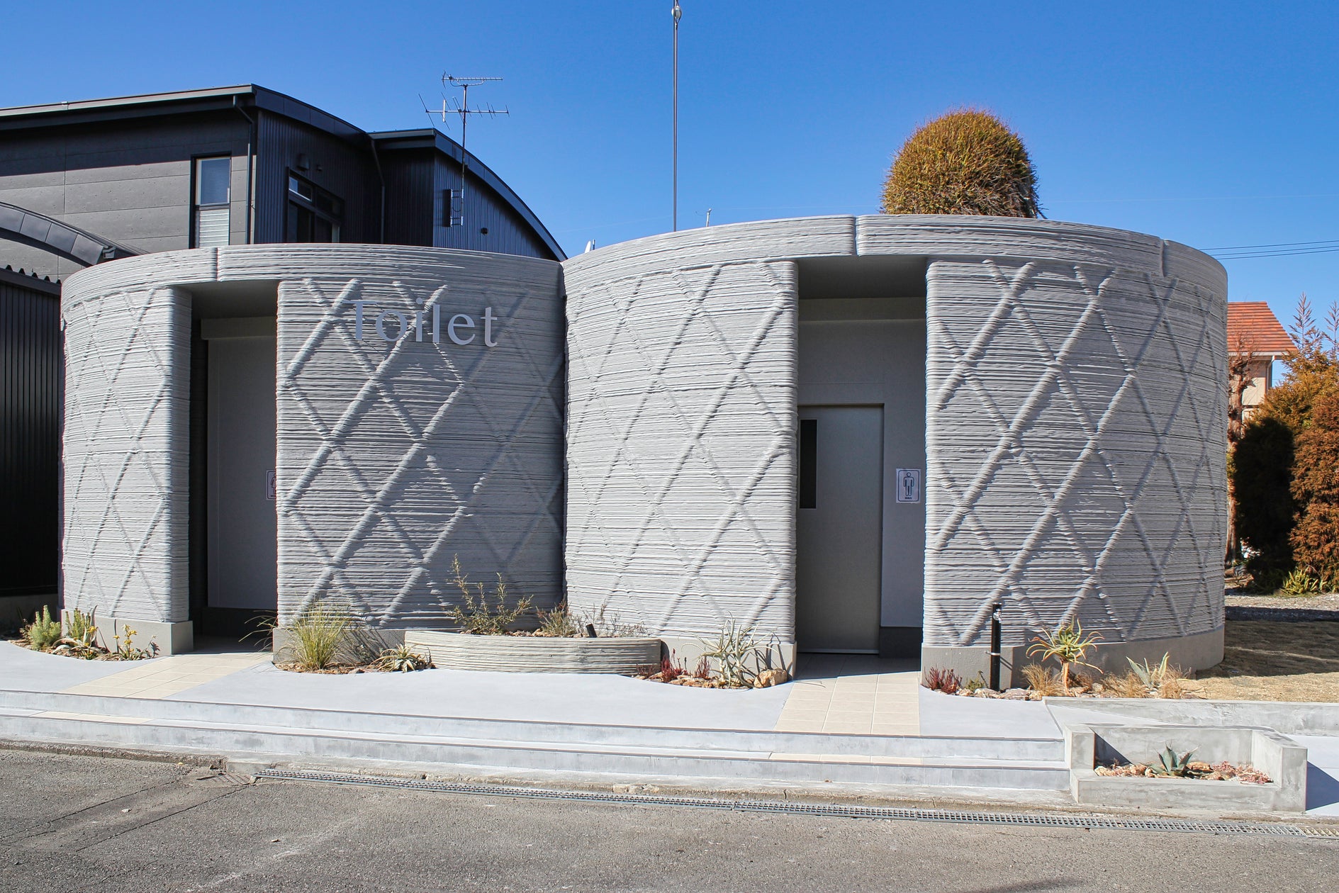 3Dプリンター技術とプレハブ建築のWPC工法を組み合わせた日本初のハイブリッド建築物が誕生しました。この建物は、静岡市駿河区の住宅展示場内にある公衆トイレとして使用されています。3Dプリンターで作られたコンクリートパネルを使用し、高耐震性とデザインの自由度を両立させています。