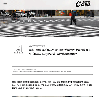 「東京・銀座のど真ん中に“公園”が誕生!? 生まれ変わった〈Ginza Sony Park〉の設計思想とは?」というGinza Sony Parkの取り組みについて取り上げている記事が、(Casa BRUTUS)に掲載されています