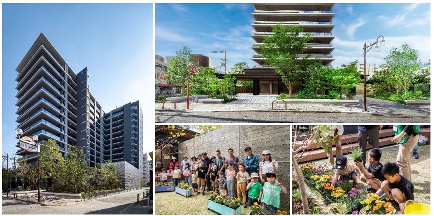 「プラウド茨木双葉町」は、大阪府の「おおさか優良緑化賞」と「みどりのまちづくり賞」で最優秀賞にあたる大阪府知事賞をW受賞しました。空地率約40%、緑地率約20%の緑化や、地域住民との交流を促進するグリーンイベントが評価され、共同住宅として初の快挙となりました。
