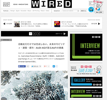 Audi Urban Future Initiative(AUFI)の取り組みを紹介している記事「自動走行だけでは完成しない、未来のモビリティ・建築・都市:AUDI AGが語るAUFIの意義」が、WIRED.jpに掲載されています。
