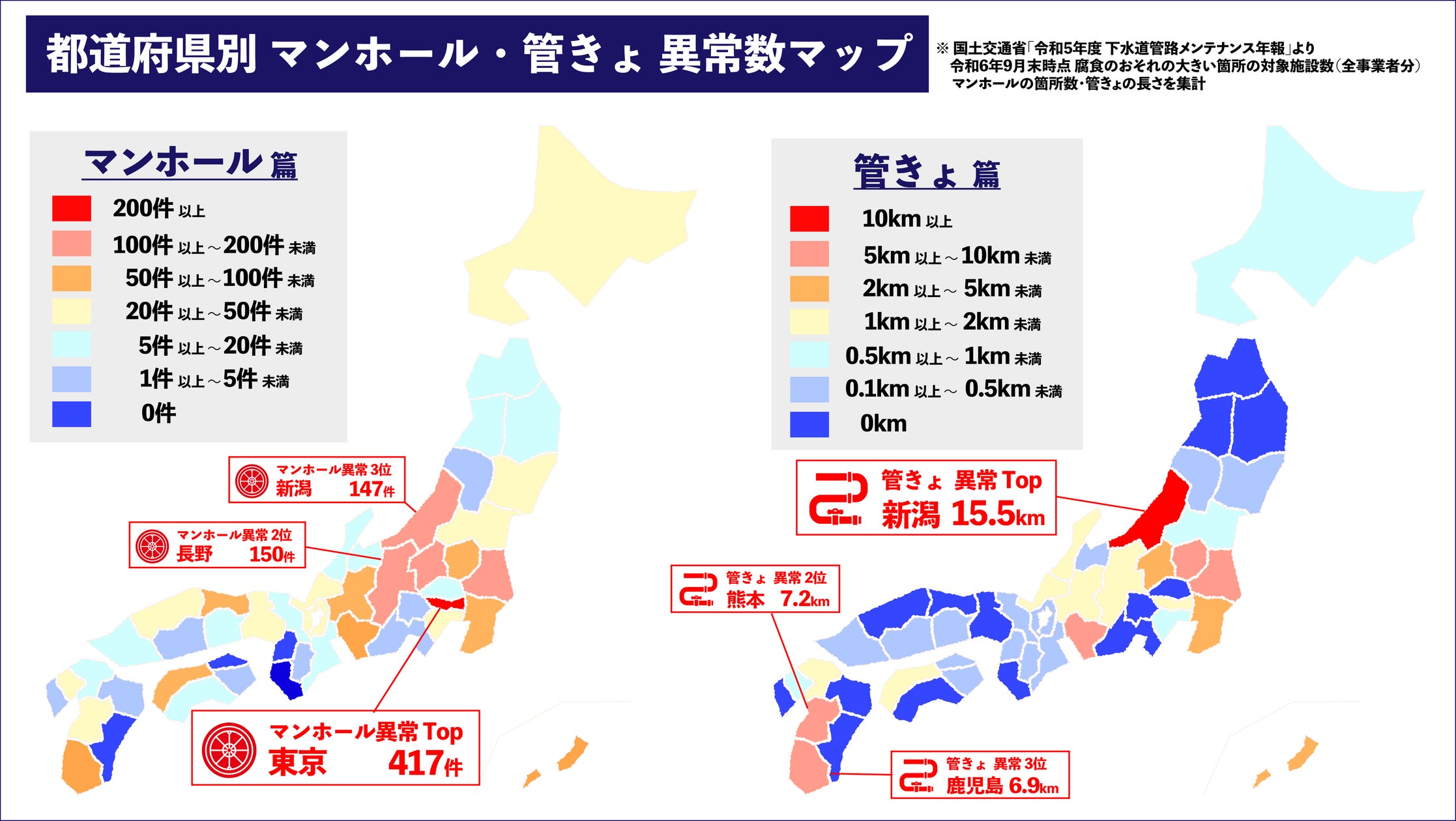 近年増加する“道路陥没”の一因となる下水道の異常 ソニー損保が都道府県ごとにまとめた下水道の異常マップを公開 管きょ異常km1位・マンホール異常数3位と新潟県が異常数上位に