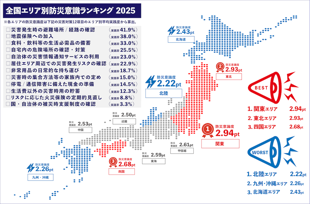 9月1日は防災の日<全国エリア別防災意識ランキング2025>「災害時に備えた貯蓄」や「火災保険の見直し」といった“経済的備え”が十分に行われていない傾向が全国で明らかに