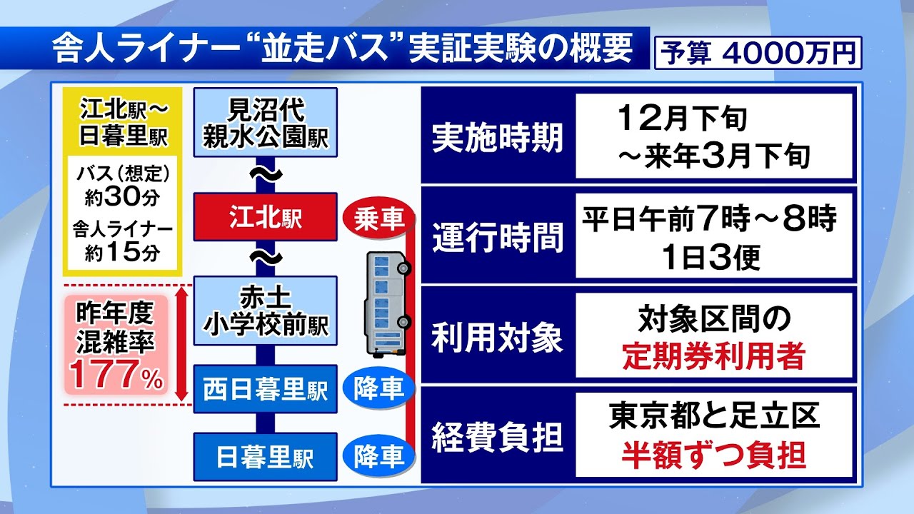 混雑率全国1位の日暮里・舎人ライナーの通勤ラッシュ緩和を目的に、東京都と足立区がシャトルバスの実証実験を開始。2025年12月下旬〜2026年3月下旬の平日朝7〜8時に、江北駅から西日暮里・日暮里駅へ1日3便を運行。対象は定期券利用者で、民間貸切バスを活用。車両増備が困難な現状を踏まえた新たな交通施策として注目されている。