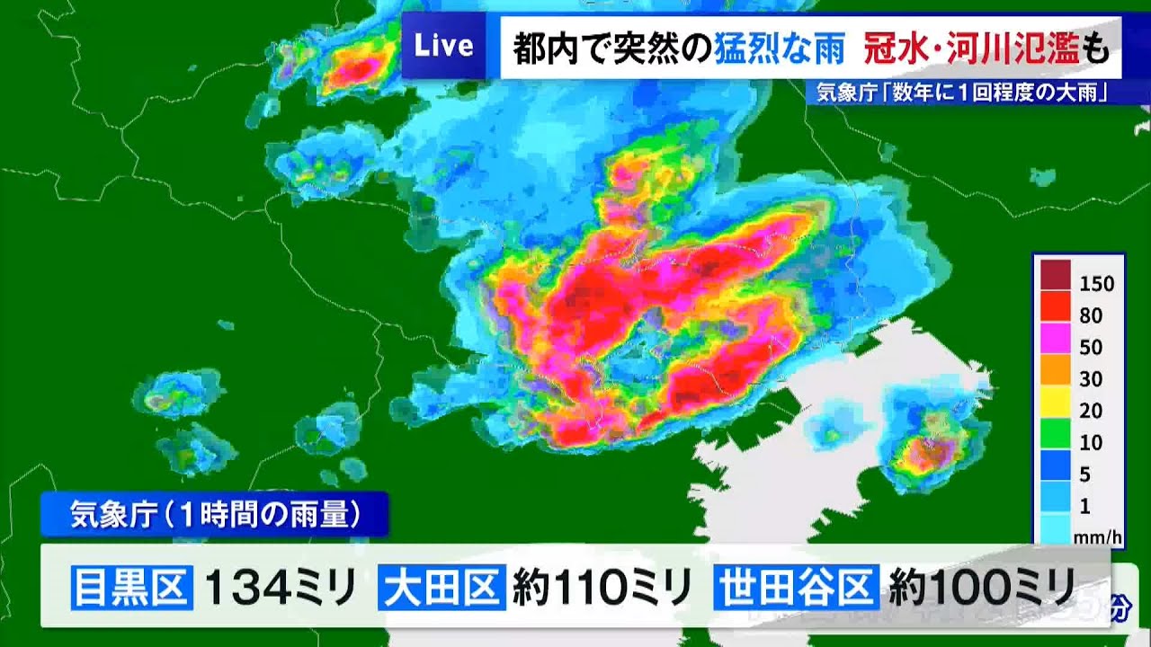 東京都内で突然の猛烈な雨…冠水・河川氾濫も「数年に1回の大雨」(youtube/TOKYO MX NEWS)