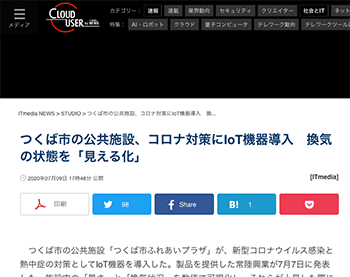 「つくば市の公共施設、コロナ対策にIoT機器導入 換気の状態を「見える化」」というつくば市の公共施設「つくば市ふれあいプラザ」での取り組みについて取り上げている記事が、ITmedia NEWSに掲載されています。→『つくば市の公共施設、コロ...