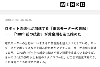 ロボット&ドローン ロボットの進化が加速する「電気モーターの世紀」──「100年前の技術」が黄金期を迎え始めた /動画あり (WIRED.jp) 「ロボットの進化が加速する「電気モーターの世紀」──「100年前の技術」が黄金期を迎え始めた」という記事が、WIRED.jpに掲載されています。→『ロボットの進化が加速する「電気モーターの世紀」──「100年前の技術」が黄金期を迎え始めた』 2018.02.16 ロボット&ドローン