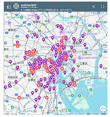 archiclue.が日々アーカイブしている街づくり・建築ニュースやプレスリリース情報の記事を地図にマッピングして、1つのインタラクティブ・マップ(マッピング・データ)に集約しました。マッピング箇所は日本国内はもちろん海外まであります。「あのニュースの場所はどこ?」「この近所で進んでいる計画は?」といった疑問に、地図を動かすだけでお答えします。